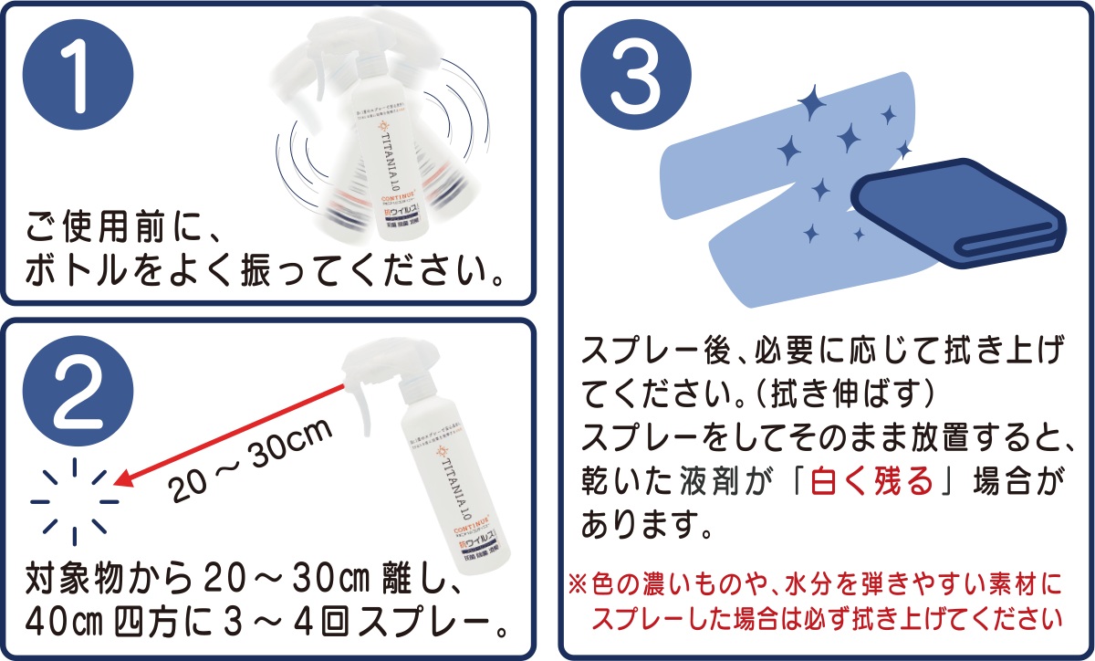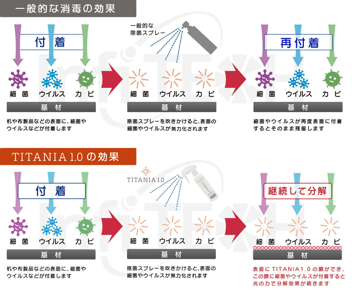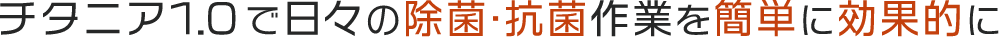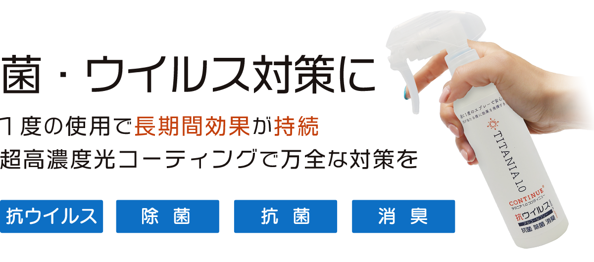 チタニア1.0 は、光が当たるたび繰り返し除菌をする効果により、1度噴霧しておけば長期間に渡り、多くの菌やウイルスを不活化できる製品です。 日々除菌を行うことが日常となった今、チタニア1.0で「少しでも楽に」「より効果的に」「作業の回数を少なく」除菌を行うことができます。 チタニア1.0は、「アルコール・次亜塩素酸ナトリウム」などと違い人体に無害な成分で作られており、場所・素材を問わず、何にでも使用可能です。